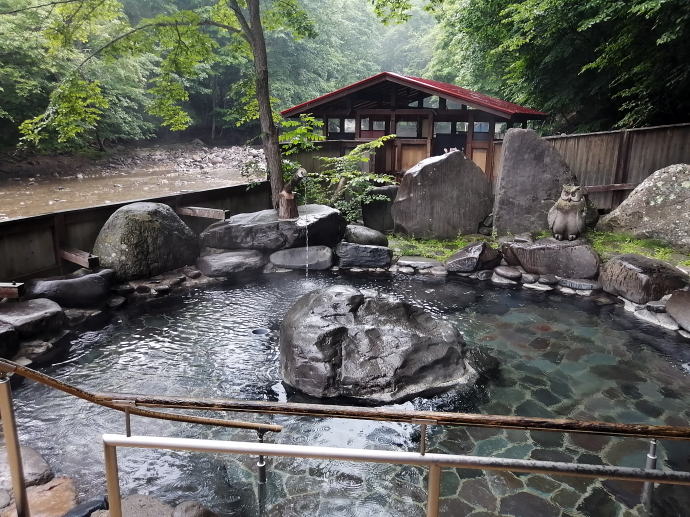 2023年夏、全日本トライアル選手権出場と カムイワッカ湯の滝を目指す旅の始まりです。 7/9敦賀発苫小牧着の新日本海フェリー『すずらん』へ乗船です。 7/10、20:30苫小牧東港に到着した『すずらん』号から 然別峡温泉『鹿の湯』を目指して夜の北海道をドライブします。 キタキツネよりもたぬきやアライグマの姿をよく見かけますね。 深夜に到着した道の駅『うりまく』で車中泊したのち、 然別峡温泉『鹿の湯』にて大自然の中、北海道上陸初入湯を果たし、 次に向かったのが、混浴が残る『芽登温泉』へ。 ![]() 芽登温泉は、北海道足寄町にある秘湯系温泉で、明治三十四年に開湯された温泉一軒宿。 名前の由来は、アイヌ語のメット=山奥という意味に由来し、 十勝地方では最古級温泉の一つとされている。 ![]() 道道88号線から糠南大橋を渡って樹海のダート道を走ること約4キロメートル、 案内板に沿って進めば、あずき色した特徴ある二階建てが見えてきた。 旅館前面を流れるヌカナン川を渡河すれば芽登温泉に到着です。 ![]() 日帰り入浴は11時からということで日帰り入浴料金700円(当時)を支払って入場します。 昭和レトロな館内には良泉を指針する動物の剥製(温泉サムライ談)が数体展示され、 温泉期待度も高鳴るこの瞬間であります。 ![]() 日本秘湯を守る会会員の宿ということでコチラ提灯も雰囲気良さげ。 左奥に進んだところにある脱衣場へと到着します。 男女混浴を備えた露天風呂は一体どんな装いを現すのだろうか。 ![]() 秘湯温泉に似合わないポップな脱衣かごが洒落た雰囲気を醸し出し、 しっかりとした金属製貴重品ロッカーも備えられ、 日帰り入浴も安心して温泉入湯が楽しめる。 ![]() 木造の壁と天井に、タイル張りの湯船は最近改築されたのかとてもきれいな内湯。 二つの湯船に無色透明の湯がまだ半分ほどしか溜まっておらず、 入湯は後にして、まずは露天風呂へと向かいます。 ![]() ふと窓の外へ視線を向けると何かが蠢く(うごめく)気配を感じます。 ネコかな?って思ってみているとどうもタヌキのようです。 枯れた木の下を掘り返してミミズでも食べているのでしょうか? ![]() まずは男女別の大露天風呂へ、 20名ほどが同時に入湯できる露天風呂は塀越しに糠南川が望めます。 高い位置にあるパイプから源泉が注がれて湯の流れ落ちる音が心地よい。 ![]() 若干小雨模様の露天風呂ではあるが、 深い山の緑に囲まれて、川のせせらぐ音と湯の流れ落ちる音、 温泉から立ち上る湯気に淡い硫黄の香りがすばらしいハーモニーを奏でます。 ![]() 湯に浸かれば、軟らかい湯触りのアルカリ性単純泉で、 くどく無い硫黄の香りは、まさに上品な温泉フレバーなのです。 源泉かけ流しで、実測温度39.3℃とぬる湯でいつまでも入っていられそう。 ![]() さて、次に向かったのは混浴露天風呂の『巨岩の湯』へ。 ここから先は旅館指定の湯浴み衣を身に着けて向かいます。 時間により男性専用・女性専用・混浴・貸切と利用できるらしい。 ![]() 巨岩が配された混浴露天風呂は河原と同化するワイルドな造り、 湯底に貼り込まれた平たい岩がカラフルできれいですね。 湯気が立ち昇る湯船は幻想的で見ているだけでウットリします。 ![]() 実測温度40.3℃の湯はしっとり身体を包み込んでくれた。 こんな大自然の中で素晴らしい温泉に浸かれるなんて…、 これぞ極楽至極なのであります。 ![]() 幸いにも(残念ながら)混浴露天風呂は私一人の独泉で、 貸し切り状態、好き放題、湯を堪能することができました。 次回は、相手を探してゆっくり宿泊で愉しみたい、そんなお宿です。 ![]() さあ、内湯湯船も水位が増したところで入湯します。 高温と低温の温度設定がなされた湯が愉しめるということで、 まずは小さい方から入ってみると、 ![]() 実測温度44.7℃と熱くはないけど適温域の温度なのです。 個人的には46℃ぐらいあれば気持ち良いのですがね。 当然、源泉かけ流しで利用されているので湯はとっても新鮮。 ![]() 続いてとなりにある長方形の湯船へと身を沈めると、 実測温度は40.7℃とぬる湯なのですが、 個人的にはもっと温い方が冷温交互浴が愉しめるのになぁ~と思いました。 ![]() 湯上がり後、周辺を散歩してみると、 付近一帯の森の中は、生態系を守るために立ち入り禁止になっています。 エゾモモンガやエゾライチョウなどが生息しているそうだ。 ここまで読んで頂いた皆様にだけお伝えします。 芽登温泉でお泊りをご検討されている方は じゃらんnetにおいて無料で空室確認ができる機能がお勧め。 煩わしい電話での問い合わせは気が引けるあなたにお勧め。 宿泊料金もポイントが使えてお安く泊まれるなど 私はいつも確認してから宿泊予約しています。 時には楽天トラベルにおいても格安プランや 高還元ポイントがゲットできるのであわせてチェックしましょう。