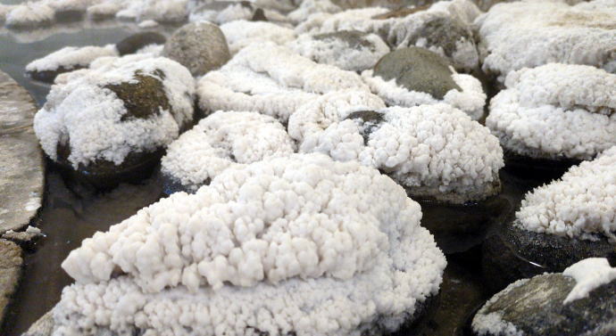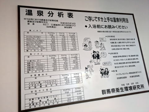 源泉名:洗湯(湯宿温泉)/泉質ナトリウム・カルシウム-硫酸塩温泉(低張性‐弱アルカリ性‐高温泉)/泉温約62.7℃/pH8.6/溶存物質計1.44g毎kg |