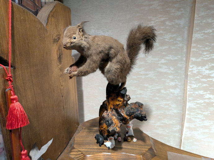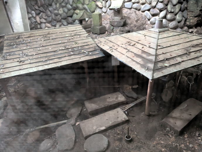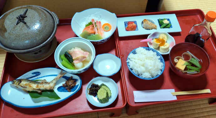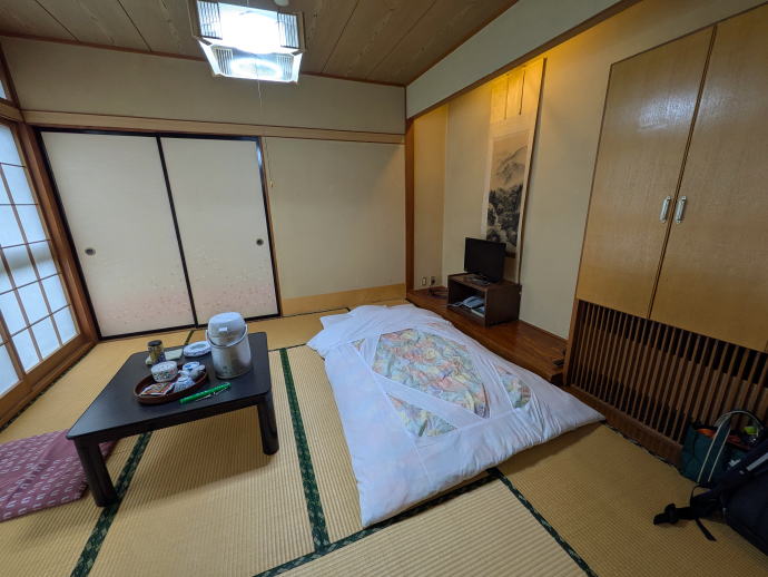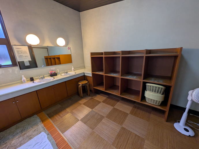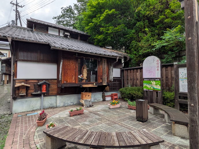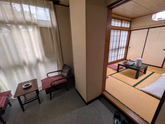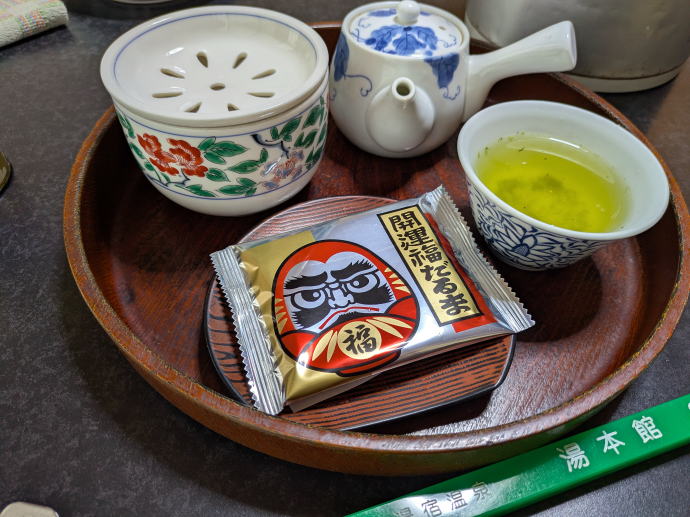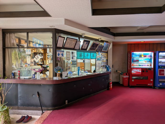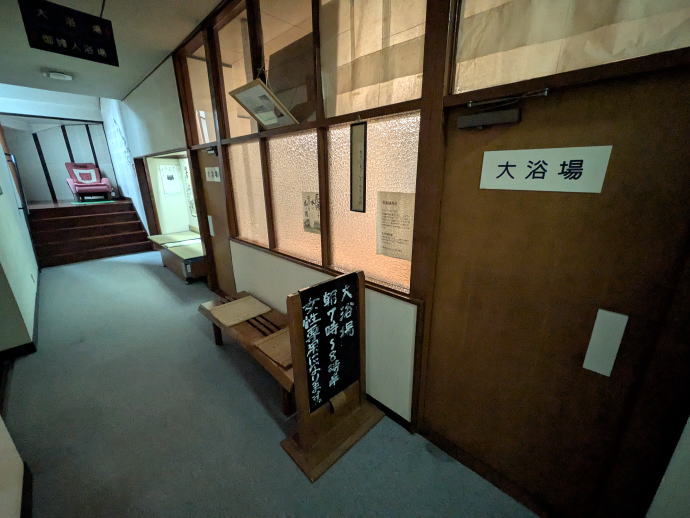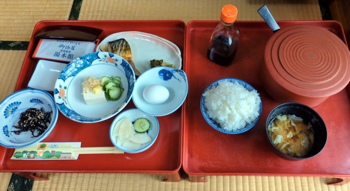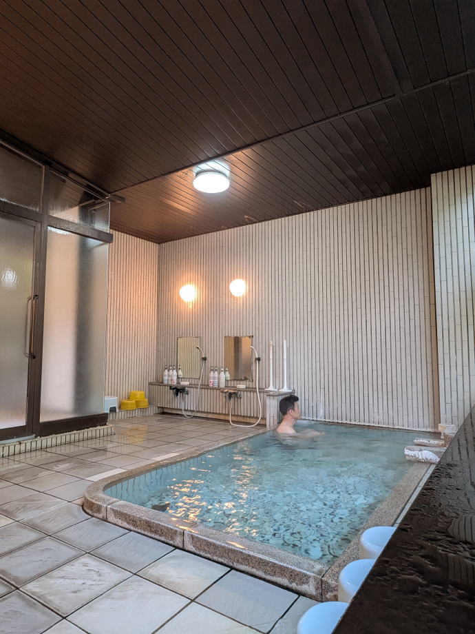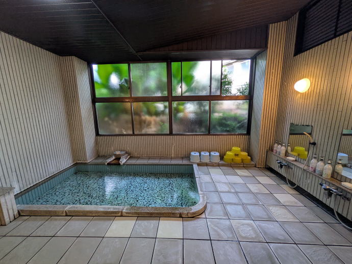2025年の夏休み『娘と巡る日光東照宮の旅』をテーマに、 三日目の宿『四季の湯温泉ホテルヘリテイジ』を出発し、 湯めぐりをしながら本日の宿『湯宿温泉湯本館』を目指します。 湯宿温泉は、約1,200年前の852(仁寿2)年2月8日、 弘須法師が岩穴にこもって読経したところ、 薬師如来が現れ種々の薬湯が湧き出したのが始まりとされています。 ![]() 湯宿温泉は、歓楽的な雰囲気はなく、とてもひなびた温泉地。 四カ所の共同浴場が点在し、一部を除いて 宿泊者はその共同浴場のカギを借用して入湯が愉しめる。 ![]() コチラ湯本館は昭和40年代に建てられた昭和レトロな温泉旅館。 外壁リペイント、内装リフォームが繰り返され、 新旧入り混じる不思議空間が繰り広げられている。 ![]() フロントではご主人と女将さんがランダムで接客をされている様子、 お風呂の場所や男女の入れ替わる時間、 夕食や朝食の時間を教えてもらって二階に客室へと案内していただいた。 ![]() トイレやバスはないけれど、 三角のスペースにイスとテーブル、洗面台が設置された広縁と、 奥に和室八畳の間があってすでにお布団が敷かれています。 ![]() ![]() ![]() お茶うけに「開運福だるま」という炭酸せんべいが提供され、 ポットのお湯で緑茶を入れて一服。 備え付けの浴衣に着替えて館内温泉巡りへ出発準備だ。 ![]() 窓からの景色は温泉街といった風景ではなく、 山間にある長閑な集落のような景色が広がります。 とうとう雨が降ってきましたね。 ![]() 館内には男女混浴の大浴場と小さな女性浴場、 さらに家族風呂がありますが、露天風呂はないようだ。 時間によって男女の入れ替えや女性専用タイムがありました。 ![]() まずは混浴の大浴場へ、脱衣場も男女の仕切りはなくここから混浴、 女性には難易度の高い混浴設定なので実質は男湯か。 鍵付きロッカーなどなく昔ながらの脱衣場で入湯準備を進めます。 ![]() 内湯ガラス引き戸を開けるとドーム状の空間に丸く大きな湯船がお出迎え。 温泉からの湯気が程よく漂い硫黄の淡い香りが鼻を擽りたまらない。 シャワーで身体を清めてから湯船へと浸かります。 ![]() あっつい…、熱いがなんと湯船に入湯イン、 お湯は無色透明の源泉かけ流し、丸湯船の縁から大量にそして静かに溢れ出す。 溢れ流れ出した湯の音が浴室空間に反響してこれまた心地よいのだ。 ![]() 実測温度は46.7℃ととっても熱いが、 湯船に浸かれば不思議とさっぱりした心地よさ。 熱いお湯だが頭と身体がスッキリさっぱりする、そんな浴感だ。 ![]() 内湯の裏手には源泉湧出地があってそこから直接源泉が湯船に注がれる。 源泉通り道の石にはプードル状に温泉成分が析出しており湯の華満開。 源泉が注がれる辺りは激熱エリアのため近寄れません。 ![]() 数分間、熱い湯船に浸かってのぼせそうになるが、 湯船から飛び出てシャワーで水を浴びればこれまた快感。 サウナの整い効果に似た感覚が味わえる。 ![]() 続いて、廊下を挟んだ向こう側にある家族風呂へ。 外来入浴も利用できるが、一人1時間1500円と高額である。 入り口、模様の入った曇りガラスの透け加減が脱衣中の方のシルエットが色っぽい。 ![]() こじんまりとした内湯の家族風呂は、近代的なタイル張り空間で、 四角い湯船からは大量のかけ流しが確認できます。 コチラもきっと激熱の湯船なんでしょうね〜 ![]() あ〜気持ちいい。 実測温度は42.7℃とぬるい湯船でありますが、 家族風呂に入っていた前者がたくさん足し水したのでしょうね。 ![]() ちなみに源泉供給口の温度は60.4℃と高温なので、 しばらく湯船を使用しなければこの温度に近づくのでしょうね。 しかし、ここまで足し水してしまうと浴感も変化するから注意です。 ![]() 夕食までもう少し時間があるので、外湯めぐりへと出発です。 その前に、薬師瑠璃光如来様に旅の安全祈願をお祈りし、 向かったのは共同浴場『小滝の湯』へ。 ![]() 帰ると夕食タイムと相成りました。 朱色のお膳が二膳、夕食を載せて客室へと運ばれてきました。 このまま食しても良いですが、テーブルに並べなおしていただきます。 ![]() 見事なまでの純粋な和食膳は質素で身体を浄化してくれそう。 アユの塩焼きはフワッとやわらかく頭までいただける。 吉野敏明が提唱する『四毒抜き』を実践する私もこれならイケる! 四毒抜きとは何ぞや! 4毒とは、小麦粉、植物性油脂、乳製品、甘いもので、それらを食生活から排除し、 健康を回復する食事療法です。 4毒抜きの食事を実践して花粉症、神経痛、脂質異常症が治りました。 現在、私は血圧も低下し、視力も回復しているのでその効果は絶大です。 このページをご覧のあなたも実践していただきたいのであります。 ![]() なべ焼きの中は豚肉と野菜の炒め物。 ビールもおいしく、白米も粒がそろていて食感最高なのです。 温泉よし、料理よし、旅館の雰囲気よし、 ![]() 良き温泉旅館に必ずある動物のはく製もコチラにはあります。 温泉サムライ談、 心も身体も
