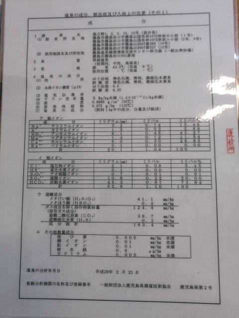 2023年春、『突然桜島が見たくなったので出発』の旅 大阪南港から志布志行きのフェリー『さんふらわあ』に飛び乗って 一路鹿児島県へ。 初日の宿、『古里温泉桜島シーサイドホテル』をチェックアウトした後、 順次温泉巡礼を続けます。 霧島神宮へ参拝後、近くで日帰り温泉を探して車を走らせていると、 登山口温泉という民宿旅館を見つけて入ってはみたものの、 日帰り入浴の湯客がいっぱいだということで断られたので、 グーグルマップを頼りに次の温泉を探してみると、 湯之野温泉『霧島市温泉健康増進交流センター「神の湯」』という 長ったらしい名前の温泉を見つけたので訪れることにしました。 ![]() 霧島市が運営する公共の温泉施設ということで 建物も共同浴場といった面持ちでもなくかなり豪華。 駐車場も広々としている割に駐車されている車の数は少なめである。 ![]() 平成10年10月銭湯形式の温泉としてオープンしたコチラ施設は、 地元の方のオアシス的な温泉なのでしょうか? それでは早速調査を開始します。 ![]() なんだか飾り気のない館内は市役所の窓口のよう、 入り口で靴を脱いで館内へと入場します。 受付で日帰り入浴料金420円を支払って浴室へと向かいます。 ![]() 広くて明るい館内ではあるが、 使い方というか、置かれた調度品にまとまりがないというか…、 これが市役所的な発想なのですかね? ![]() きれいなフローリングで美しい床が続く先に、 男女別の脱衣場入り口が見えてきました。 ではでは早速脱衣場へ、 ![]() 古風な脱衣場には鍵付きの木製ロッカーをはじめ、 金属製の貴重品ロッカーも設置され安心して日帰り入浴が楽しめる。 壁に掲げられた温泉成分表によると泉質は単純泉であります。 ![]() ガラス窓から差し込む陽の光が優しく包み込む内湯空間、 窓際に細長く続くのは12メートル歩行浴用の湯船なのだ。 その先端にあるのが主浴槽の大きな湯船です。 ![]() 源泉温度58.8℃ではあるが、湯船からのオーバーフローはなく 循環加温式で加水あり、塩素滅菌ありと残念なお湯ではありますが、 広々とした内湯空間で温泉を愉しみます。 ![]() 軟らかい浴感を感じさせるお湯は実測温度41.9℃と適温の湯 無色透明のように見えるお湯も若干青みがかかった爽快感のあるお湯なのです。 せっかくの高温泉を豪快に源泉かけ流しで利用できたら最高なんですがね…。 ![]() この施設、入湯料金が安いわりにサウナがあって、 入湯客はサウナに集中していて湯船にはあまり人がいない様子。 水風呂も装備されサウナーにはたまりませんね。 ![]() シャワーとカランがあるエリアにはシャンプーなどのアメニティーはなく、 お風呂のイスは一カ所に集約されていて使用の度に持ち運ぶ必要があります。 ここは銭湯的な温泉施設ということになるだろう。 ![]() 湯上がり後は、マッサージチェアや血圧を測ったりと身体のケアをしたり、 ゆっくりソファーで休息もできる、そんな空間も備えられています。 温泉マニアには物足らない内容ですが、地元民の癒しの施設としては良いかもです。 次は本日のお宿『さくらさくら温泉』を目指します。 霧島温泉周辺でお泊りをお考えの方へ。 ご予約は宿へ直接するよりも じゃらんnetや楽天トラベルを介して予約する方が