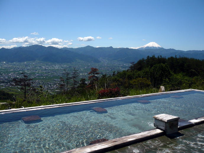 | コメント | 甲府盆地を一望する標高700メートルにある温泉は、遠くに富士山を望む風光明媚な露天風呂。 |