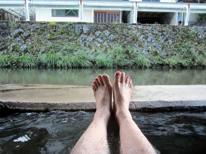 満願寺温泉川湯を指しています。 この有名な川湯の他に2つの内湯の共同湯があります。 温泉会館(男女別浴)は川湯のそば、 上流に「上の湯」があります。 「上の湯」は混浴ですが、 一応「地域住民のみ入浴可」という内容の掲示がありました。 内鍵をかけてはいけないという地域ルールがあるので、 貸し切りではなく、混浴に該当すると思います。 ![]() 私はこれら3つに入浴し、 川湯では自分の足が湯面から突き出た自撮りをしました。 その直後、コンパクトデジカメが、水に浸かってもいないのに、 硫黄蒸気のためか電気配線が破壊されたような音がしてお釈迦になりました。 ![]() 満願寺温泉では、 「バックパッカーズ山肴(さんこう)」に泊まりました(素泊まりのみ)。 オーナーの戸田さんから、温泉のこと、湯のこと、端島のこと、 興味深いお話をたくさんいただきました。