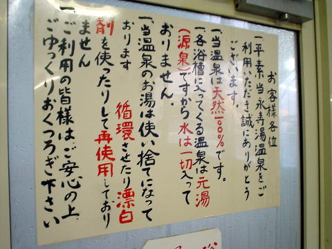 まずは右端の「低温」の湯舟から入湯するが、 これが結構熱い。 実測48.3度あって決して「低温」ではない。 先客の方に話を伺ったが 今日はちょっと熱いめだと言いながら 水の蛇口を開けて温度を下げていた。 ![]() 湯に浸かるときの「お願い」 「アア ハズカシイ」 よく注意書きを読んでお入り下さい。 ![]() 湯舟壁際には飲泉できるように 1合升が置かれていたので飲泉すると、 日の出湯のものとは塩の加減がちょっと違うようです。 永寿湯の方が塩分控えめといった感じで飲みやすい。 ゆっくり味わうまもなく湯の熱さで外に飛び出した。 中央の[中温]湯舟に挑戦です。 入湯する前に温度を測ると実測なんと50.5度! 熱い湯に慣れてきたとはいえ50度オーバーの湯はさすがに熱い。 ゆっくりと湯に首まで浸かるが10秒が限界だ。