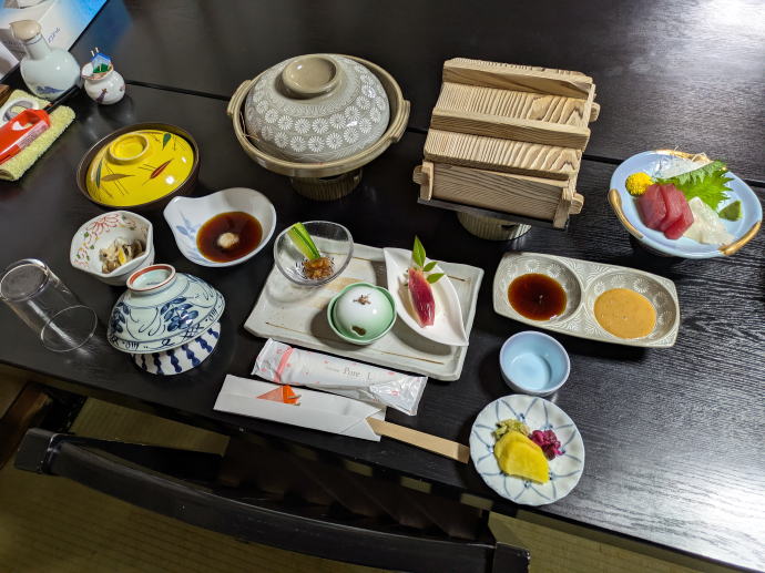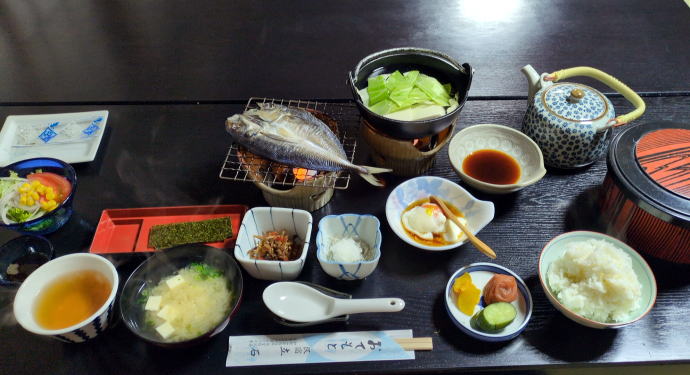 小鉢や椀物、焼き物はこんな感じ、 しめじの酢の物はなかなかの一品、うまかった。 茶碗蒸しは梅干しが入っていて初めてのお味なのでした。 夕食を堪能したのちにもう一度温泉に入泉してから早めに就寝、夢の中へ。 早朝は5時に起床して恒例の朝散歩を楽しみました。 民宿から田代滝を目指したが闇夜の中、なにも望めずそのまま帰ります。 ![]() 朝早く暗い中をたくさんの人が歩いていたので声をかけてみた。 私:「おはようございます、今からどちらへ行かれるのですか?」 女性:「……I dont speaking Japanese」 私:「您从哪里来的?」(どちらからこられましたか?) と不得意の中国語で攻めてみれば返事が返ってきた。 女性:「From Malaysia」マレーシアからの観光客でした。 今から熊野小路へハイキングに出かけるらしく、 20名ほどの団体さんなので熊野小路をめぐるツアーなのかな? と思いつつ、民宿へと帰ってまいりました。 民宿へ帰るや否や準備を整え、 お隣にある川湯温泉『公衆浴場』へ開湯時間に合わせて行きました。 豪快なかけ流し温泉でとても鄙びた共同浴場で私好みでした。 ![]() 朝から散歩と豪快なかけ流し温泉を堪能したのちに朝食タイム。 朝食も夕食を食べた同じ場所での提供です。 ご覧のような豪華な内容となっています。 ![]() 朝からアジの開きを直火であぶっていただけるとは なかなか日常ではできない贅沢なことです。 おいしかった朝食をごちそうさまでした。 ![]() 朝食後はもう一度仙人風呂へ入泉して川湯温泉を締めくくります。 いや~ここは存分に温泉を満喫できていいですよ。 近畿地方にてこんな開放的で男女が入泉できる混浴はないかもです。 ![]() 川湯温泉には混浴で楽しめる露天風呂がもう一つあります。 仙人風呂が開湯していない時期にだけ入湯できる『薬師の湯』 ここは5軒の旅館民宿が管理する露天風呂で、水着を着用すれば誰でも入湯できる。 快適に過ごすことができた民宿立石の若大将は、 私の車に積み込んでいるトライアル車を見るなり話しかけてきた。 若大将もオフロードバイクを乗っておられるということで会話を楽しみました。 惜しまれつつ民宿を後にして、 次に向かった先は那智天然温泉跡にある側溝の湯を探索します。 周辺でで宿をお探しの方、 宿に直接予約するよりもYahoo!トラベルや楽天トラベルを介してする方が ポイントが使えてお安く泊まれることが多いですよ。↓