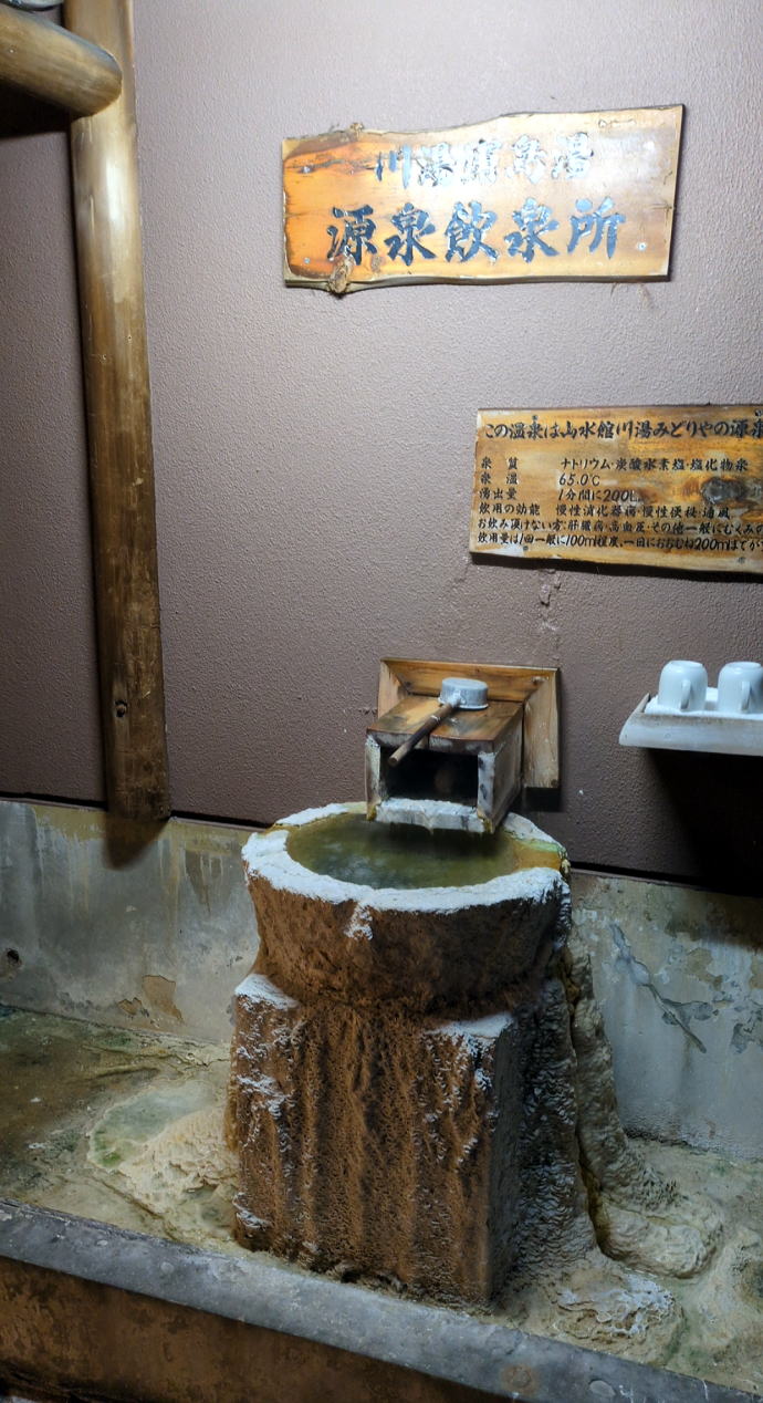 2025年12月、今年最後の温泉巡礼の旅は 奈良県と和歌山県の温泉を訪れてみました。 二日目の宿泊地にと選んだのがコチラ川湯温泉『民宿立石』 ![]() ここは、川湯温泉『仙人風呂』がある「大塔川」の目前にあって 料金が安くてお料理がとてもおいしそうだったので選んでみました。 仙人風呂と民宿を合わせて楽しもうとやってまいりました。 ![]() 家族経営されているコチラ民宿は、 建物やその内部、おもてなしもとっても家庭的な雰囲気で心地よい。 案内していただいたのが二階の和室六畳のお部屋です。 ![]() ご主人にお茶を入れていただいて、 仙人風呂の入湯方法などを伺いました。 露天風呂からの帰り道が寒いので特別の羽織を貸していただけるらしい。 ![]() 夕方の陽射しが優しく客室を温めてくれる本日、 客室窓からの風景は、大塔川を望めるナイスビュー、 趣ある薬師橋がアクセントとなって美しい風景が楽しめた。 ![]() お茶を一服いただいてから、 部屋に備え付けてあった浴衣に着替えて仙人風呂の行く準備を進めます。 以前は裸でも入湯できた仙人風呂も今では水着着用になりました。 ![]() 防寒の羽織とタオルを借りてイザ仙人風呂へ。 仙人風呂へは目前の薬師橋を渡って対岸からアクセスするか、 道路を下流方向へ進むと向かうことができます。 ![]() 仙人風呂で大自然を満喫し、最高のお湯を堪能したのちは、 民宿にある温泉をも楽しむことにします。 浴室は一階一番奥の突き当りにあります。 ![]() 入り口扉に掲げられた札を『入浴中』にすれば貸し切りで利用できます。 こじんまりとした脱衣場にはタオルとバスタオルが備えてあって自由に使えます。 準備を整えて浴室へ、 ![]() なかなかシックな内風呂には モダンな変形湯船がひとつ、透明な湯に満たされていた。 浴室には淡い硫化水素の香りが鼻を擽ります。 ![]() 湯船の温度は若干冷め気味の実測38.7℃ですが、 手元の蛇口を捻ると源泉が供給され自動的に完全なかけ流し温泉となる。 適温になるまでしばらく時間はかかったが、 ![]() 湯に含まれる濃いめの塩分にて身体の芯まで温まる感覚があった。 源泉ホースの先には、湯の華を除去するためのガーゼが巻きつけてあって、 実測49.8℃の源泉供給量は少なくなっていた。 ![]() そうこうしている内に夕食の時間と相成りました。 1階食事処にて準備されているテーブルへ、ご覧のような内容です。 本来あるべき天ぷらを変更していただいて今回は特別料理です。 ![]() 中でもおいしかったのがご主人が自ら釣り上げたというアユの塩焼き。 程よい焼き加減で香ばしく忘れられないお味なのです。 また機会があれば食べたい一品なのでした。 ![]() 今回は、天ぷらなどの植物油と小麦粉を排除してもらって 本来のメニューを変更していただいてありがとうございました。 蒸した野菜やキノコもおいしかったですよ。
