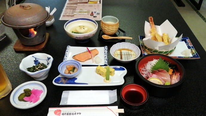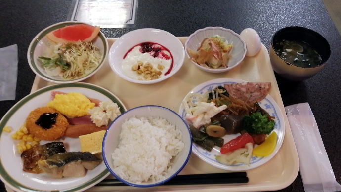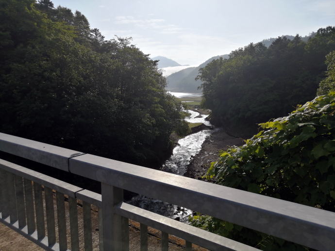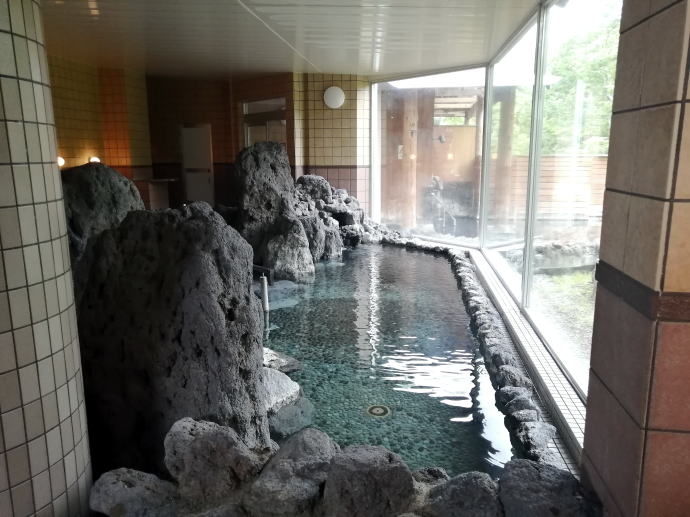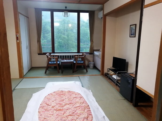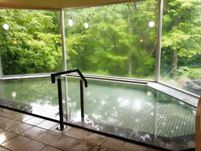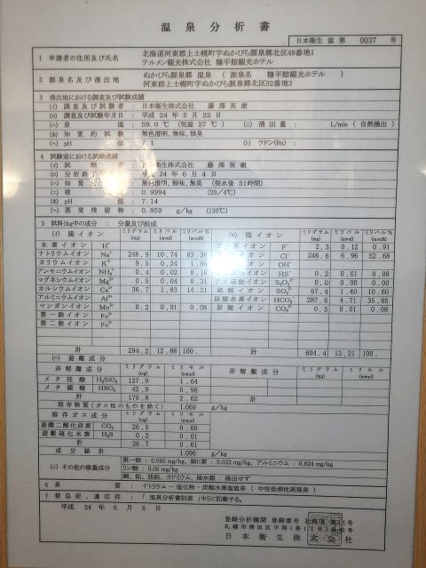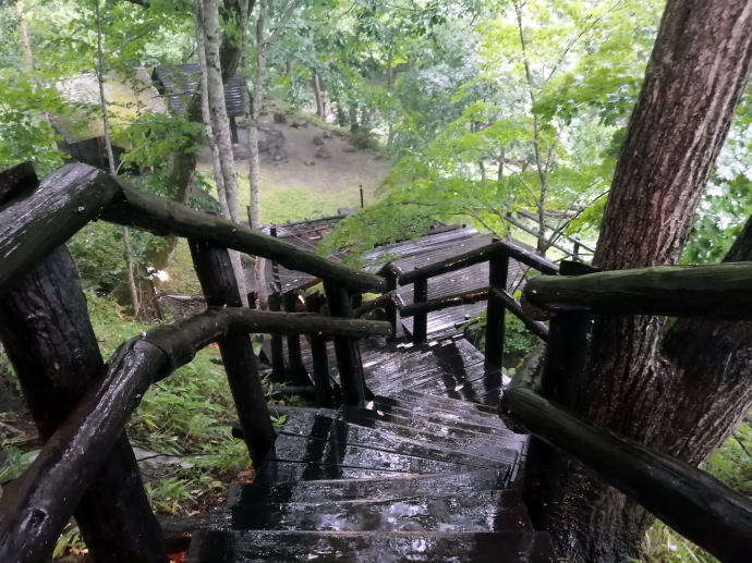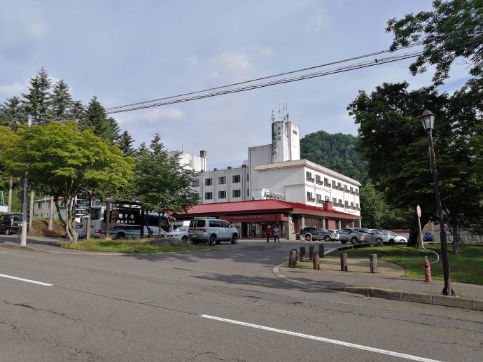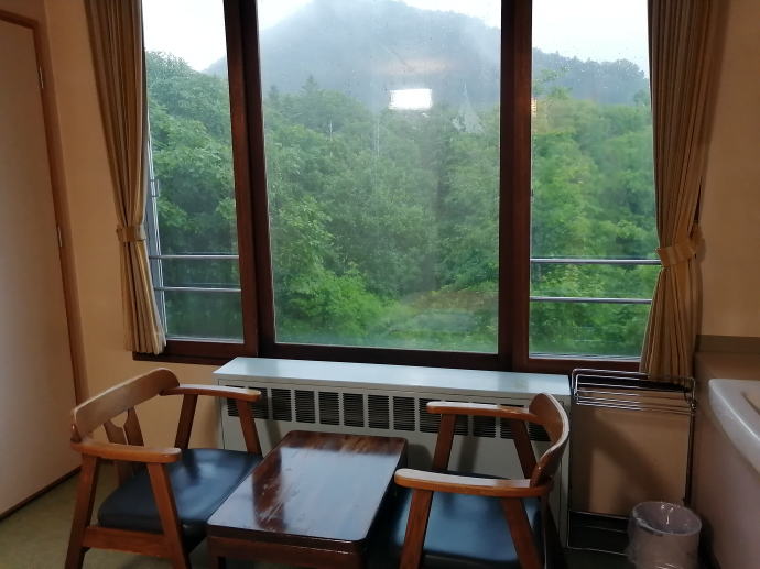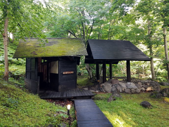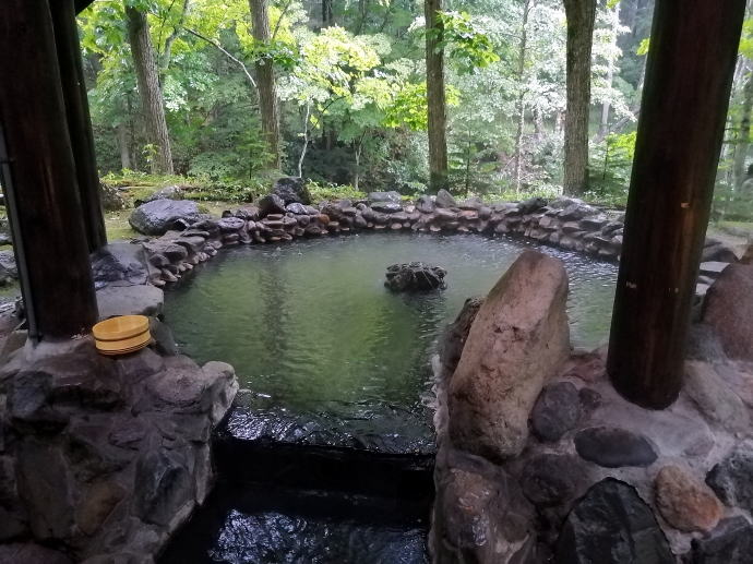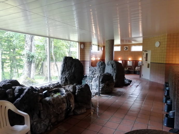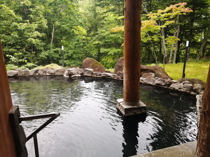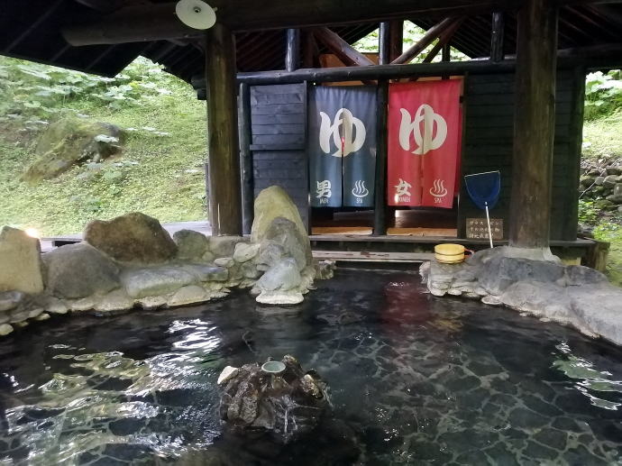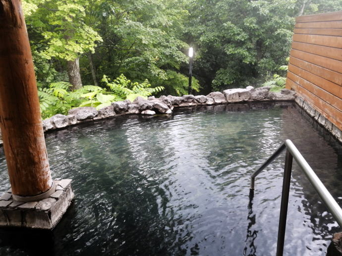 2023年夏、全日本トライアル選手権出場と カムイワッカ湯の滝を目指す旅の始まりです。 7/9敦賀発苫小牧着の新日本海フェリー『すずらん』へ乗船です。 7/10、20:30苫小牧東港に到着した『すずらん』号から 然別峡温泉を目指して夜の北海道をドライブします。 キタキツネよりもたぬきやアライグマの姿をよく見かけます。 然別峡温泉『鹿の湯』で入湯後、芽登温泉を経由してやってたのが、 北海道二日目の宿『ぬかびら源泉郷温泉 糠平舘観光ホテル』 ここは言わずと知れた混浴を備える温泉ホテル。 ![]() (次の日の画像で、到着時は雨) 到着時はあいにくの雨模様ではあるが、 雨天時でも湯めぐりが愉しめるよう前向きに心を切り替えるべく、 荷物をまとめてホテル内へと向かいます。 ![]() 外観チョッピリ古ぼけた糠平舘観光ホテルは、 大正6年に創業した歴史ある温泉ホテル、 客室数88室、334人が宿泊できるとても大きなホテルなのです。 外国人観光客もたくさんチェックインされていく中、 私もその中に紛れて受付していただいた。 指定された3階の客室へと向かいます。 ![]() 館内は白い壁を基調に若干冷たい感じがしますが、 流されているBGMは、となりのトトロ主題歌『風のとおり道』(久石譲)の曲なので、 古ぼけた施設もこの曲の恩恵を受けて郷愁感を享受できました。 ![]() すでにお布団が敷かれた和室の客室は、 踏み込みあり広縁ありバストイレ付となかなか快適な空間です。 空調機もあるから暑い夏でも安心して泊まれそう。 ![]() ホテルの形態ではあるが、 古来からある日本の旅館を再現した客室で落ち着いた空間を提供していた。 若干古さは感じますが、これもまたいいもんだ。 ![]() 窓からは北海道らしい原生林の景色が脈々と続いているかのよう。 曇天の空からは雨が降り注ぎ、気分も沈みがちだが ここは気分を切り替えて館内温泉巡りの準備を進めます。 とりあえず荷物を置いて、 「糠平舘観光ホテル」のロゴ入り浴衣に着替えて まずは当ホテルの最大の目的地、混浴の「仙郷の湯」へ向かいます。 ![]() ロビーを突き当たって左奥から続く混浴露天風呂の通路は、 ここで履き物をスリッパに履き替えて屋外へと向かいます。 雨が降っているので傘も借りて露天風呂へ。 ![]() ウッドデッキ調の通路が下へ下へと続く道、 雨で滑りやすくなっている木の階段40段を慎重に降りて行きます。 遠くから川のせせらぐ音が聞こえてきます。 ![]() ウッドデッキがシロアリなのか経年劣化なのか 破損したり腐食している所もあるが、なんとか無事に到着します。 右側が混浴露天風呂で左の苔むした屋根が脱衣場。 ![]() ![]() 脱衣場内部は脱衣かごのみ置かれた簡素な脱衣場、 結構な雨漏りがあるから脱衣するのもひと苦労ではあるが、 浴衣なので少々濡れても問題ないかな。 ![]() でもヤッパリ、雨に濡れたらイヤだから、 脱衣かごを裏返してカバンを置いてその上に浴衣を置いて…、 さらに上、傘で覆って雨に濡れないようにしました。 ![]() 東屋の下にある円形岩風呂は混浴露天風呂『仙郷の湯』もちろん完全かけ流し、 湯船へと続く通路は溢れた湯が流され足元もあたたか。 湯船の向こうの谷筋には糠平川のせせらぎが垣間見えます。 ![]() スッキリとした浴感で若干のツルスベ感も享受できる湯は、 完全かけ流しで滅菌臭は皆無の湯なのです。 実測温度は41.2℃でとっても入りやすい。 ![]() 湯船の中央部から湧き出すようにして注がれる湯の温度は、 実測42.8℃でかなりの湯量が供給されていた。 淡い重曹の香りも感じられる落ち着ける浴感だ。 ![]() 周りに広がる大自然に抱かれてしばしの温泉タイム。 雨が降っているためか他に入湯するものもなく独泉状態です。 温泉浴はもちろん森林浴も存分に楽しめました。 ![]() 続いては大浴場と露天仙人風呂へと向かいます。 次の日の朝には男女浴室が入れ替わるため、 チェックイン当日に必ず入湯したいコチラ浴室。 ![]() 大変シンプルな脱衣場は、 三段の脱衣ボックスと椅子があって大変シンプルです。 浴衣をササっと脱ぎ捨て浴室へと進みます。 ![]() 前面に大きなガラス窓、その向こうには大自然の森が一望できる。 右方には、露天仙人風呂が確認できました。 そんなロケーションの前に無色透明の湯に満たされた湯舟がひとつ。 ![]() 泉質は、ナトリウム-塩化物・炭酸水素塩温泉、 源泉温度は59℃と高いため夏季は10%から15%の加水がされているという。 実測温度は41.6℃、もちろん源泉かけ流しを実現しております。 ![]() 内湯には、サウナも装備されておりサウナーも存分に楽しめる。 タイル張りの真新しく感じられる内湯内には 小さいながら水風呂も準備されていて心地よく利用できました。 ![]() 内湯から階段を数段降りたところのある露天風呂の『木の湯』 カラマツの木を使っているというが、左の木の柱のことでしょうか? 雨に濡れた生き生きとした森の景色が素晴らしいです。 ![]() 男女の湯船を分かつ木の塀には、 その昔、男女両湯船が行き