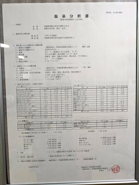 | 泉質 | ![]() 源泉名:ごぜんやま温泉/ナトリウム−硫酸塩冷鉱泉(低張性‐弱アルカリ性‐冷鉱泉)/源泉温度22.6度/湧出量:78リットル毎分/成分総計:1.857グラム毎Kg |