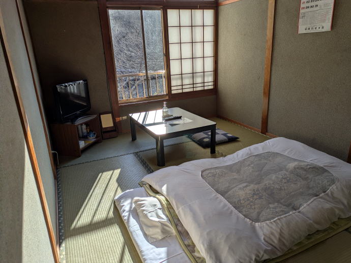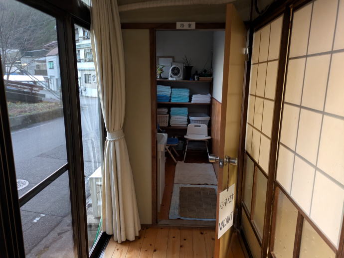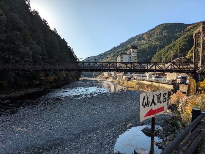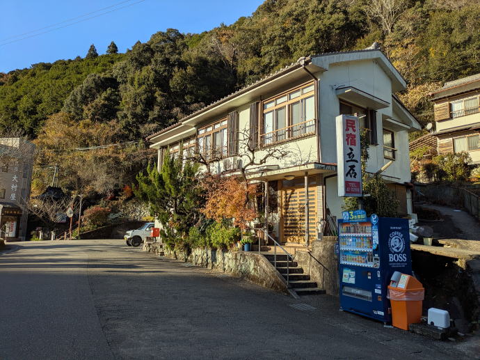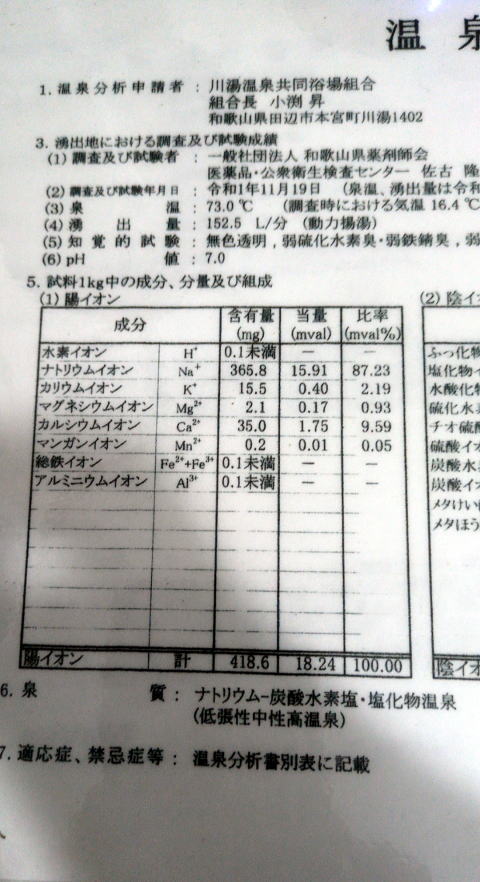 2025年12月、今年最後の温泉巡礼の旅は 奈良県と和歌山県の温泉を訪れてみました。 二日目の宿泊地にと選んだのがコチラ川湯温泉『民宿立石』 ![]() ここは、川湯温泉『仙人風呂』がある「大塔川」の目前にあって 料金が安くてお料理がとてもおいしそうだったので選んでみました。 仙人風呂と民宿を合わせて楽しもうとやってまいりました。 ![]() 家族経営されているコチラ民宿は、 建物やその内部、おもてなしもとっても家庭的な雰囲気で心地よい。 案内していただいたのが二階の和室六畳のお部屋です。 ![]() ご主人にお茶を入れていただいて、 仙人風呂の入湯方法などを伺いました。 露天風呂からの帰り道が寒いので特別の羽織を貸していただけるらしい。 ![]() 夕方の陽射しが優しく客室を温めてくれる本日、 客室窓からの風景は、大塔川を望めるナイスビュー、 趣ある薬師橋がアクセントとなって美しい風景が楽しめた。 ![]() お茶を一服いただいてから、 部屋に備え付けてあった浴衣に着替えて仙人風呂の行く準備を進めます。 以前は裸でも入湯できた仙人風呂も今では水着着用になりました。 ![]() 防寒の羽織とタオルを借りてイザ仙人風呂へ。 仙人風呂へは目前の薬師橋を渡って対岸からアクセスするか、 道路を下流方向へ進むと向かうことができます。 ![]() 仙人風呂で大自然を満喫し、最高のお湯を堪能したのちは、 民宿にある温泉をも楽しむことにします。 浴室は一階一番奥の突き当りにあります。 ![]() 入り口扉に掲げられた札を『入浴中』にすれば貸し切りで利用できます。 こじんまりとした脱衣場にはタオルとバスタオルが備えてあって自由に使えます。 準備を整えて浴室へ、 ![]() なかなかシックな内風呂には モダンな変形湯船がひとつ、透明な湯に満たされていた。 浴室には淡い硫化水素の香りが鼻を擽ります。 ![]() 湯船の温度は若干冷め気味の実測38.7℃ですが、 手元の蛇口を捻ると源泉が供給され自動的に完全なかけ流し温泉となる。 適温になるまでしばらく時間はかかったが、 ![]() 湯に含まれる濃いめの塩分にて身体の芯まで温まる感覚があった。 源泉ホースの先には、湯の華を除去するためのガーゼが巻きつけてあって、 実測49.8℃の源泉供給量は少なくなっていた。 ![]() そうこうしている内に夕食の時間と相成りました。 1階食事処にて準備されているテーブルへ、ご覧のような内容です。 本来あるべき天ぷらを変更していただいて今回は特別料理です。 ![]() 中でもおいしかったのがご主人が自ら釣り上げたというアユの塩焼き。 程よい焼き加減で香ばしく忘れられないお味なのです。 また機会があれば食べたい一品なのでした。 ![]() 今回は、天ぷらなどの植物油と小麦粉を排除してもらって 本来のメニューを変更していただいてありがとうございました。 蒸した野菜やキノコもおいしかったですよ。