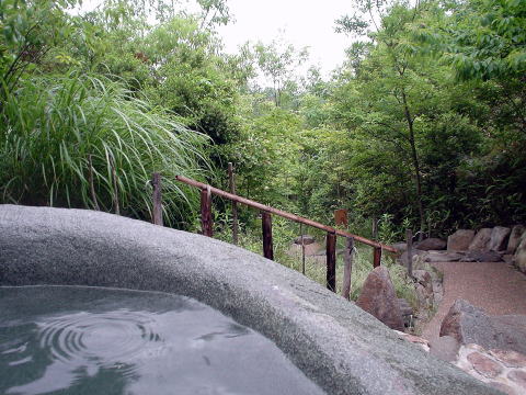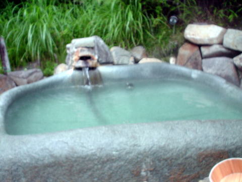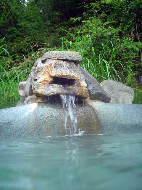 露天風呂は浴舎と山際の境目に岩組みされた長細い湯船で、