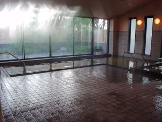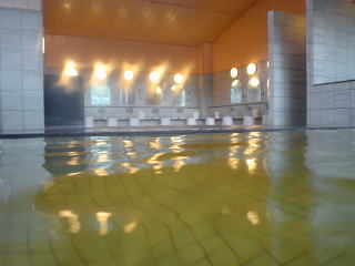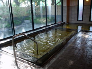 浴室はモダンな感じのタイル張りで、大きなガラス窓に沿ってエル型の湯船がある。その湯船の湯口付近は熱く、中央部低い仕切りから下はヌル目のお湯だ。湯口からは源泉がこんこんとかけ流されている。 ここのお湯は源泉温度が高いため若干加水され温度を下げて供給されているが、微黄褐色のアルカリ性で、ヌルっとした肌触り。循環ろ過や塩素滅菌はしていない純然たる完全かけ流しのホンモノの温泉なのだ。 サウナや水風呂などもあるのでその施設は充実している。 |