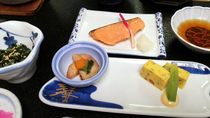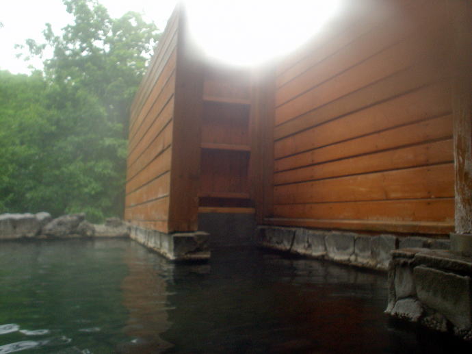 2023年夏、全日本トライアル選手権出場と カムイワッカ湯の滝を目指す旅の始まりです。 7/9敦賀発苫小牧着の新日本海フェリー『すずらん』へ乗船です。 7/10、20:30苫小牧東港に到着した『すずらん』号から 然別峡温泉を目指して夜の北海道をドライブします。 キタキツネよりもたぬきやアライグマの姿をよく見かけます。 然別峡温泉『鹿の湯』で入湯後、芽登温泉を経由してやってたのが、 北海道二日目の宿『ぬかびら源泉郷温泉 糠平舘観光ホテル』 ここは言わずと知れた混浴を備える温泉ホテル。 ![]() (次の日の画像で、到着時は雨) 到着時はあいにくの雨模様ではあるが、 雨天時でも湯めぐりが愉しめるよう前向きに心を切り替えるべく、 荷物をまとめてホテル内へと向かいます。 ![]() 外観チョッピリ古ぼけた糠平舘観光ホテルは、 大正6年に創業した歴史ある温泉ホテル、 客室数88室、334人が宿泊できるとても大きなホテルなのです。 外国人観光客もたくさんチェックインされていく中、 私もその中に紛れて受付していただいた。 指定された3階の客室へと向かいます。 ![]() 館内は白い壁を基調に若干冷たい感じがしますが、 流されているBGMは、となりのトトロ主題歌『風のとおり道』(久石譲)の曲なので、 古ぼけた施設もこの曲の恩恵を受けて郷愁感を享受できました。 ![]() すでにお布団が敷かれた和室の客室は、 踏み込みあり広縁ありバストイレ付となかなか快適な空間です。 空調機もあるから暑い夏でも安心して泊まれそう。 ![]() ホテルの形態ではあるが、 古来からある日本の旅館を再現した客室で落ち着いた空間を提供していた。 若干古さは感じますが、これもまたいいもんだ。 ![]() 窓からは北海道らしい原生林の景色が脈々と続いているかのよう。 曇天の空からは雨が降り注ぎ、気分も沈みがちだが ここは気分を切り替えて館内温泉巡りの準備を進めます。 とりあえず荷物を置いて、 「糠平舘観光ホテル」のロゴ入り浴衣に着替えて まずは当ホテルの最大の目的地、混浴の「仙郷の湯」へ向かいます。 ![]() ロビーを突き当たって左奥から続く混浴露天風呂の通路は、 ここで履き物をスリッパに履き替えて屋外へと向かいます。 雨が降っているので傘も借りて露天風呂へ。 ![]() ウッドデッキ調の通路が下へ下へと続く道、 雨で滑りやすくなっている木の階段40段を慎重に降りて行きます。 遠くから川のせせらぐ音が聞こえてきます。 ![]() ウッドデッキがシロアリなのか経年劣化なのか 破損したり腐食している所もあるが、なんとか無事に到着します。 右側が混浴露天風呂で左の苔むした屋根が脱衣場。 ![]() ![]() 脱衣場内部は脱衣かごのみ置かれた簡素な脱衣場、 結構な雨漏りがあるから脱衣するのもひと苦労ではあるが、 浴衣なので少々濡れても問題ないかな。 ![]() でもヤッパリ、雨に濡れたらイヤだから、 脱衣かごを裏返してカバンを置いてその上に浴衣を置いて…、 さらに上、傘で覆って雨に濡れないようにしました。 ![]() 東屋の下にある円形岩風呂は混浴露天風呂『仙郷の湯』もちろん完全かけ流し、 湯船へと続く通路は溢れた湯が流され足元もあたたか。 湯船の向こうの谷筋には糠平川のせせらぎが垣間見えます。 ![]() スッキリとした浴感で若干のツルスベ感も享受できる湯は、 完全かけ流しで滅菌臭は皆無の湯なのです。 実測温度は41.2℃でとっても入りやすい。 ![]() 湯船の中央部から湧き出すようにして注がれる湯の温度は、 実測42.8℃でかなりの湯量が供給されていた。 淡い重曹の香りも感じられる落ち着ける浴感だ。 ![]() 周りに広がる大自然に抱かれてしばしの温泉タイム。 雨が降っているためか他に入湯するものもなく独泉状態です。 温泉浴はもちろん森林浴も存分に楽しめました。 ![]() 続いては大浴場と露天仙人風呂へと向かいます。 次の日の朝には男女浴室が入れ替わるため、 チェックイン当日に必ず入湯したいコチラ浴室。 ![]() 大変シンプルな脱衣場は、 三段の脱衣ボックスと椅子があって大変シンプルです。 浴衣をササっと脱ぎ捨て浴室へと進みます。 ![]() 前面に大きなガラス窓、その向こうには大自然の森が一望できる。 右方には、露天仙人風呂が確認できました。 そんなロケーションの前に無色透明の湯に満たされた湯舟がひとつ。 ![]() 泉質は、ナトリウム-塩化物・炭酸水素塩温泉、 源泉温度は59℃と高いため夏季は10%から15%の加水がされているという。 実測温度は41.6℃、もちろん源泉かけ流しを実現しております。 ![]() 内湯には、サウナも装備されておりサウナーも存分に楽しめる。 タイル張りの真新しく感じられる内湯内には 小さいながら水風呂も準備されていて心地よく利用できました。 ![]() 内湯から階段を数段降りたところのある露天風呂の『木の湯』 カラマツの木を使っているというが、左の木の柱のことでしょうか? 雨に濡れた生き生きとした森の景色が素晴らしいです。 ![]() 男女の湯船を分かつ木の塀には、 その昔、男女両湯船が行き